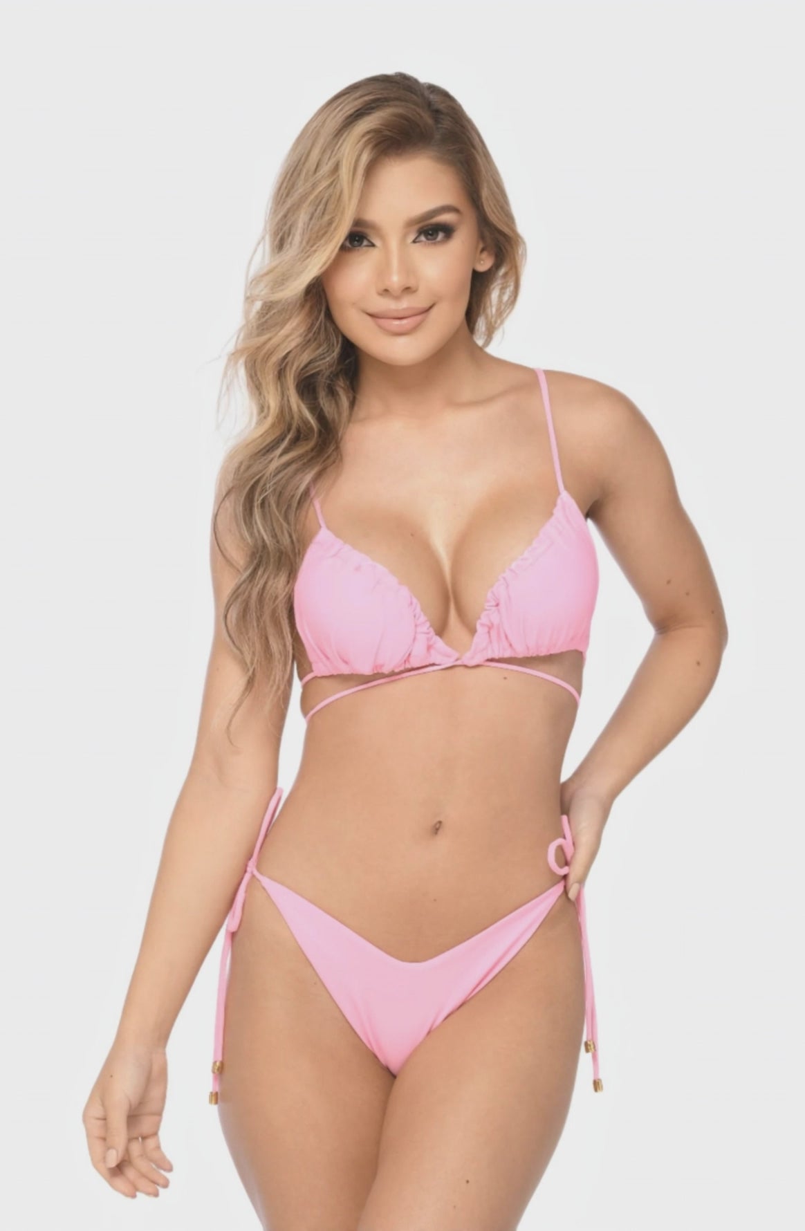 This enchanting two-piece swimsuit features subtle gathering on the top's front, creating a delicate and defined neckline and an additional back strap is added, accentuating the overall design. The bottom boasts minimal coverage on the back. Adjustable straps, removable pads, and gold terminations, this bikini offers a customizable fit.
