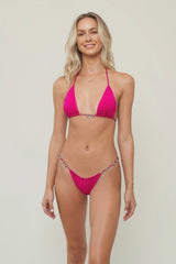 KAI is a stunning pink micro bikini full of silver metallic sea charms that won't fade in the sun. The top features removable pads and adjustable straps for a perfect fit, while the thong-style bottom accentuates your curves. Made with heat-resistant nickel charms, this bikini is both stylish and durable.
