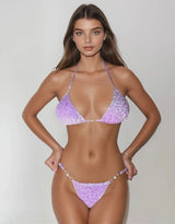 LILAC offers a luxurious, adjustable bikini made from delicate lavender or purple mesh fabric with velvet prints. The pearl accessories add a touch of elegance to the top and bottom, while the adjustable straps provide a perfect fit. The thin style of the bottom ensures comfort and style.