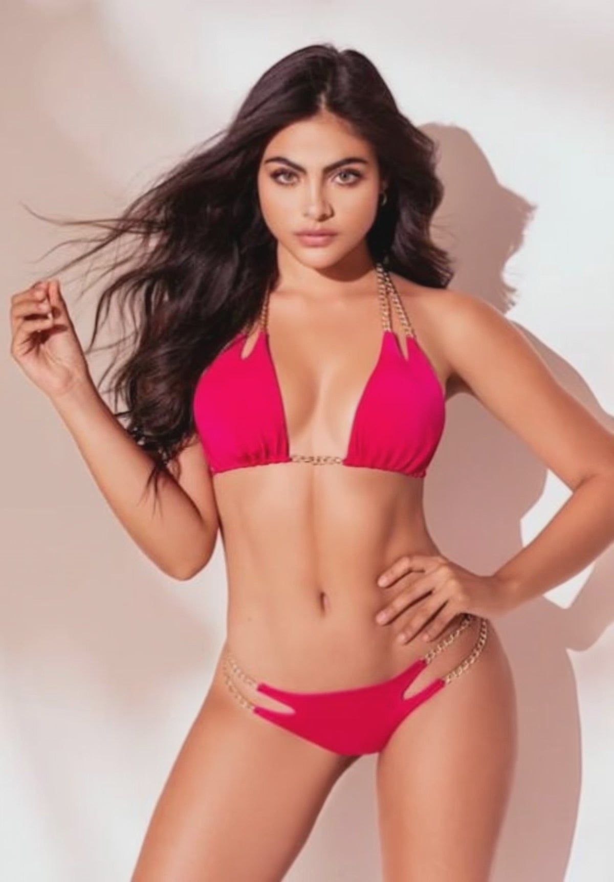 This product boasts a striking red or blue color and stunning golden chains that outline an oval-shaped cutout. The elegant gathering at the back creates a beautiful, flattering fit.