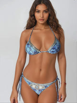 Expertly crafted for a stunning beach look, the Zaya bikini features a unique printed design and gathering on the back for a flattering cheeky style. With hand-made detailing and adjustable straps, this blue bikini is both fashionable and functional.